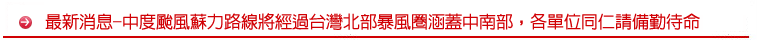 中度颱風蘇力路線將經過台灣北部暴風圈涵蓋中南部,各單位同仁請備勤待命