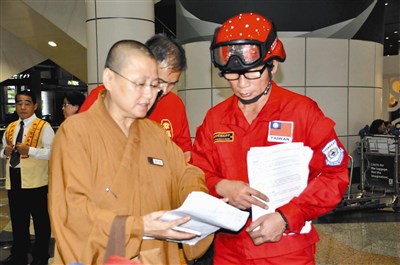駐馬來西亞台北經濟文化辦事處組長林渭德、副組長周啟宇到機場予以通關協助,大批人馬剛出海關後,佛光山新馬總住持覺誠法師立刻與中華搜救總隊長呂正宗、佛光山慈悲基金會的佛光山雲水醫療隊成員說明災區概況。