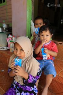 美味呀…,久違了的牛奶。牛奶是最受小童歡迎的賑災品。(圖:星洲日報)