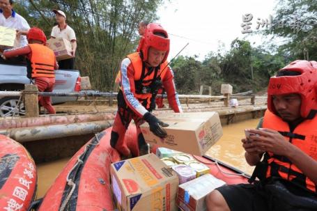 搜救隊員將汽艇運來物資,搬往受困甘榜內予以派發。(圖:星洲日報)