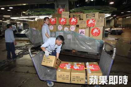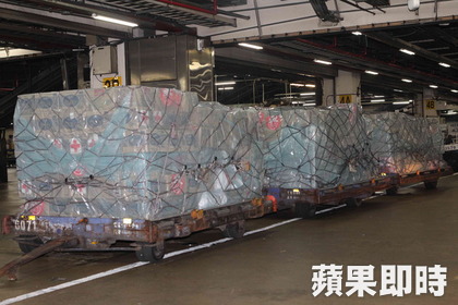 地勤人員將物資搬上貨盤。陳啟明攝