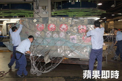 地勤人員將物資綑綁、固定。陳啟明攝