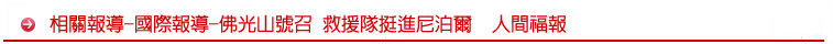 尼泊爾大地震已造成重大死傷,物資嚴重缺乏,亟需國際援助,台灣方面,在佛光山、國際佛光會統籌號召下,包括中華民國紅十字總會、中華民國搜救總隊,高雄長庚醫院等團體組成「人間有情.同體共生—尼泊爾四合一救援總隊」昨天前往尼泊爾展開救援。