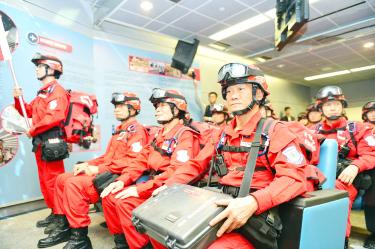 Members of a rescue team from the Buddha’s Light International Association yesterday prepare to depart Taipei for Nepal.