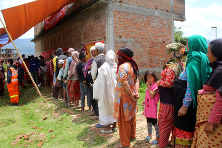 台灣民間團體組尼泊爾救援團,29日赴毗鄰加德滿都的拉利波爾(Lalitpur)縣哈瑞錫迪(Harisiddhi)村設醫療站並發放物資。災民們排隊等待接受檢查。(中央社)