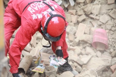 中華民國搜救總隊隊員於加德滿都東部的Harisiddhi小村莊進行搜救。(圖片由高雄長庚提供)