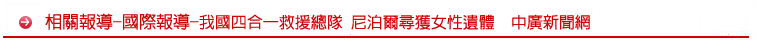 我國的「四合一救援總隊」,在尼泊爾接獲重災區災民請求協助,有一位女士受困瓦礫堆中,救援組與醫療組成員立即趕往現場(PRANIDHI地區)搜索,並醫治災民,2個小時後尋獲多日來遍尋不著的女性遺體,親屬相當感激。