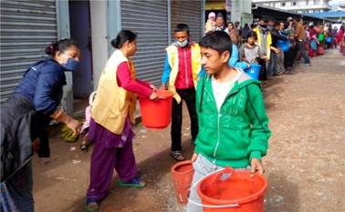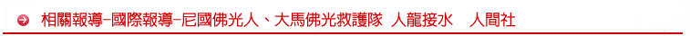 而佛光會尼泊爾協會則在加德滿都城郊及偏遠地區,發放食物等物資給予500餘戶受災家庭。當地因缺乏水源,佛光人與村民攜手組成一條人龍,以徒手接力的方式協助災民搬運水源,解決災民所需,同時也給予心靈慰問。