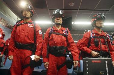 Taiwan's emergency search and rescue team members stand for inspection before heading to Nepal to assist with the earthquake relief effort at the Taoyuan International Airport in Taoyuan, Taiwan, Tuesday, April 28, 2015. Saturday's magnitude 7.8 earthquake spread horror from Kathmandu to small villages and to the slopes of Mount Everest, triggering an avalanche that buried part of the base camp packed with foreign climbers preparing to make their summit attempts. (AP Photo/Chiang Ying-ying) |