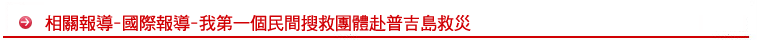 【大紀元12月28日報導】(據中廣新聞報導)前往南亞地區協助救災的我國第一個民間團體〔中華搜救總隊〕,在1日誌工協會號召華航、東森慈善基金會、演藝體育界名人捐款贊助下,今天中午攜帶著生命探測器等高科技器材和泡麵等補給品,搭乘華航班機直飛普吉島協助救災。〔曾盛豪報導〕