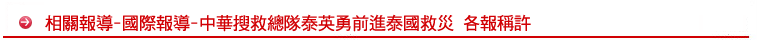 【本報訊】前來泰國南部協助救災的中華搜救總隊,人溺己溺的精神獲得泰國民眾的高度讚許;泰國的泰文報紙「泰叻報」、「今日報」與英文的「曼谷郵報」、「民族報」都大幅報導,為台灣做了成功的國民外交。