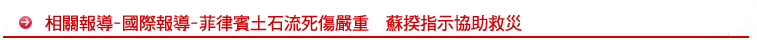 菲律賓雷伊泰島昨天發生土石流災情,數千人死傷。蘇揆今天表達哀悼,立即指示外交部捐贈十萬美元;衛生署提供醫療緊急救助物資;中華民國搜救總隊明天將赴菲國,投入救災工作。