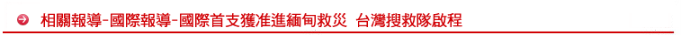 緬甸日前發生重大風災,造成二萬人死亡和四萬多人失蹤的嚴重災情,但緬甸軍政府謝絕外國救援隊伍進入協助救災,不過首支獲得核准進入緬甸的台灣的中華民國搜救總隊今天上午在靈鷲山心道法師率領下,帶著十位勘災先遣隊員和三噸飲水和物資啟程出發前往救災。