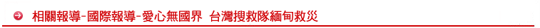 緬甸受災慘重,台灣也加入國際救援行列,緬甸方面肯定我國對風災救援相當有經驗。中華搜救總隊今天上午飛往緬甸。是繼美國之後第二個進入災區的國家,一箱箱礦泉水,泡麵,口糧等物資,全都運到機場準備託運。得到緬甸軍政府外交部門許可,中華搜救總隊一早就整裝出發,搭乘早班班機前往緬甸救災。搜救總隊攜帶八公噸糧食,精密探測器等裝備,做好萬全準備;他們擔心緬甸軍政府封鎖消息,現在傳出來的災情可能只是冰山一角。往返緬甸台灣兩地的台商們轉述,緬甸許多地區目前通訊中斷,糧食短缺,狀況相當不樂觀。台商表示,緬甸首都地區還算是災情相對輕微的,鄉下地區恐怕更加嚴重。但由於緬甸軍政府目前拒發簽證,只允許美方和我方搜救人員以外交特許方式入境,因此進一步災情,還有待救難隊深入災區之後,才能明朗。