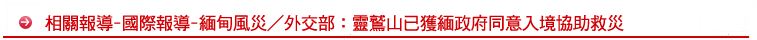 外交部7日表示,緬甸遭受納吉斯熱帶氣旋侵襲造成嚴重傷亡,我政府及人民基於救災無國界之人道關懷精神,並響應東協秘書長Surin Pitsuwan對協助緬甸賑災工作之呼籲,除將協調中華民國搜救總隊派員前往緬甸協助救援外,並將提供20萬美元之緊急賑災款,以協助緬甸災後重建工作。
