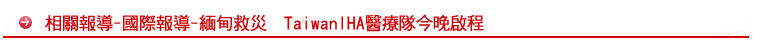 (中央社記者陳舜協台北二十三日電)緬甸在今年五月 三日遭受熱帶氣旋納吉斯侵襲,造成至少八萬人喪生、 經濟損失超過一百億美元慘劇,經多次聯繫,緬甸政府 同意台灣國際醫衛行動團隊(TaiwanIHA)、中華民國搜救總隊等單位前往救援、提供醫療服務,預定今天深 夜啟程。