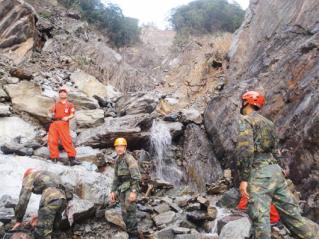 記者與攻頂隊伍才登上兩公尺高攔沙壩,就看到去年十月被大水沖毀的大片崩落山坡,大家面面相覷,連訓練有素的搜救總隊教官們也忍不住皺眉,「今天的搜救任務是場硬仗!」