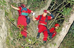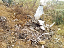 搜救人員14日清晨4點半從蘇花公路116.4k處出發上山,找尋3名飛官及2架失事軍機的下落。於10點27分在東澳雷達站下方200公尺處,發現編號300093、有「馬拉道」太陽神圖騰的5506的RF-5F偵照機機骸。(鄧博仁攝、曾百村翻攝)