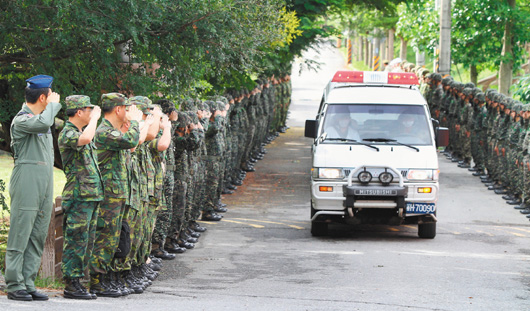 三位飛官遺體移置花蓮八○五國軍醫院,袍澤特別列隊敬禮。 記者陳柏亨/攝影