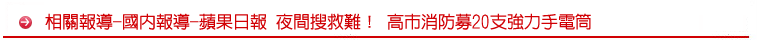 高雄氣爆造成逾8000戶民宅停電,不少地方失去照明,夜間搜救更添困難。高雄氣爆救災後援團FB表示,高市消防大隊希望能在晚上6:00以前,募集到20支「強力手持式手電筒」,並送至二聖路跟英明路交叉口的前進指揮所消防隊,協助搜救生還者。