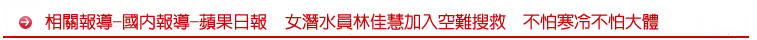 復興空難水下搜救工作持續進行,在搜救潛水員行列中,從事房屋仲介業的林佳慧也主動加入搜救,她說潛水是自己的興趣,一聽到需要潛水救援,立刻自告奮勇參加.雖然搜救難免遇到大體,但她說不怕,只是水很冷,在水中無法久待,她的勇氣跟耐力不輸給男生,也讓同行的男性隊友都對他豎起大拇指。
