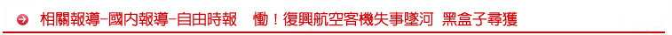 〔本報訊〕復興航空預定飛往金門的編號B22816客機,今天上午由台北松山機場起飛不到2分鐘就失聯,飛機直接偏離軌道,最後擦撞高架橋面與一輛計程車後,機頭直接栽進南湖大橋下的基隆河,截至下午3時50分,現場傳出已有26人死亡、14人受傷,且仍有17人下落不明。俗稱「黑盒子」飛行紀錄器與座艙通話記錄器已尋獲,將有助於釐清事故發生原因。