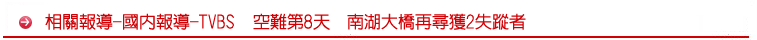 時間:2015/02/11 14:40 復興空難第8天,下午1點40分左右,搜救人員在南湖大橋下方200公尺的地方,由海巡人員尋獲2具男性遺體,2人都在座位上、繫著安全帶,其中一人確定是台籍乘客楊榮添,另一名是陸籍乘客,身分還在確認當中。
