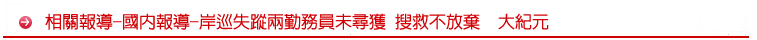 【大紀元2016年02月02日訊】(中央社新北市2日電)海巡署岸總局台北商港安檢所,兩名岸巡人員黃姓少尉與牛姓役男,疑似墜海,今天持續陸海空搜救,可惜仍未尋獲。第二二岸巡大隊長楊勝松晚上表示,「搜救沒有最後時間表」。