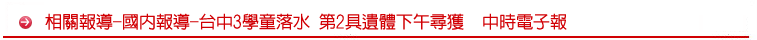 台中市太平區昨日下午大雨導致溪水暴漲,3名國小學童疑似被溪水沖走,繼今早在中投公路橋下大里溪尋獲11歲李姓男童,搜救人員沿著大肚溪往下搜尋,約14點19分在大肚溪出海口,再發現另一具男童遺體在沙灘上,經過採證後,確認為12歲陳姓男童,警方並通知陳姓男童家屬前往。