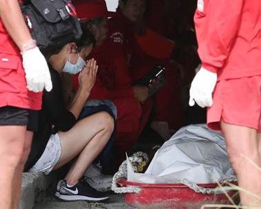 下午搜救人員在大肚溪、國道1號下尋獲12歲陳姓男童的遺體,男童家屬前往認屍後,相當不捨,雙手合十為他祝禱誦經。(黃國峰攝)