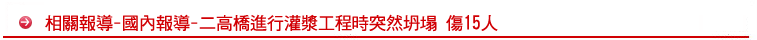 中二高草屯段高架橋塌陷事故,造成十五人輕重傷,其中包括十一名外勞、兩名本地勞工與兩名駕駛路過的民眾,經診治後所幸均無生命危險,惟其中有十名傷患因傷勢較重,必須住院繼續觀察治療。