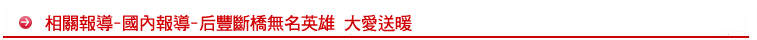 后里慈濟志工從電視上獲知斷橋事件,14日晚間8點左右即動員到場勘察,當時風大雨大,員警、救難人員全身濕淋淋,志工隨即送來熱呼呼的薑母茶、麵線羹,慰問救難人員的辛勞。