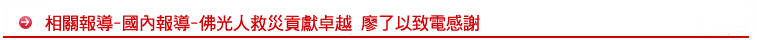 莫拉克風災肆虐南台灣,佛光人、政府單位、民間團體三方協力救災,佛光人的表現突出,獲得各界高度肯定。內政部長廖了以昨天致電國際佛光會中華總會秘書長覺培法師,感謝佛光人投入救災行列,中華民國搜救總隊總隊長呂正宗也認為佛光人貢獻卓越。
