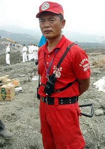 重創南台灣的88水災,造成數百人的家園破碎,生離死別。來自救災團體的服務,災民的心靈可獲撫慰。圖為中華民國搜救總隊員李樹池在新開災區挖掘遺體。//中央社