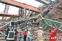 【綜合報導】國道六號高速公路昨發生闢建以來最嚴重的鷹架倒塌工安意外,造成7死、3傷事件。位於南投縣國姓鄉的北山交流道匝道工程,7名工人進行灌漿時,下方鷹架突然崩塌,7人隨著2千公噸重鋼架、木條及鋼筋混凝土墜落下方50公尺深溪床,被埋在扭曲如小山的建材下,經搶救後,1名台灣工人及6名印尼籍外勞罹難。現場工人說:「當時以為是大地震來了!嚇死人了。」 國工局南投工務段主任卓高端指出,出事的交流道工程,昨進行第三單元箱樑閉合混凝土灌漿作業,初步研判可能灌漿時震動,造成支撐架鬆脫移位,產生不平衡骨牌效應。真正原因仍待調查。