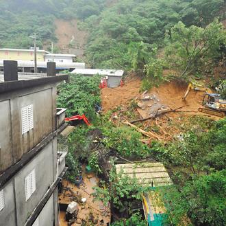 蘇澳鎮冷泉路的白雲寺和鄰近民宅遭土石流淹沒,九人被活埋,救難人員開著怪手在一片狼藉中搜尋失蹤的民眾。記者陳正興/攝影