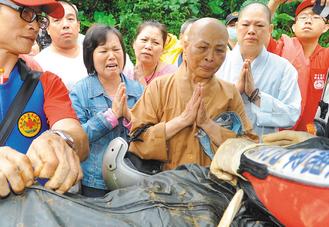 信眾見到寺廟的師父遺體被尋獲,雙手合十,送她最後一程。 記者陳正興/攝影