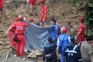 蘇澳冷泉路的白雲寺發生山崩,造成數名出家法師遭掩埋,在救難人員搶救下,遺體陸續被挖出,但都已不幸罹難。(記者鹿俊為攝)