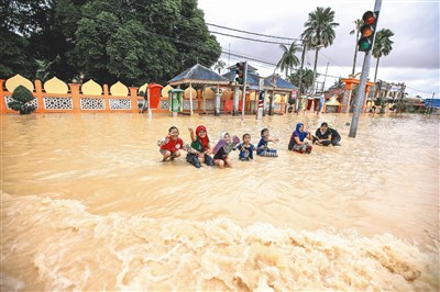 馬來西亞吉蘭丹州幾位村民,苦中作樂在洪水中玩耍。馬國這波三十年來最嚴重的水患,已造成至少五人喪生,十幾萬人撤離家園避難。圖/歐新社