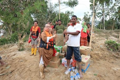 如行法師深入甘榜,移交賑災品給已喪失居所及一切財物的災黎。(圖:星洲日報)