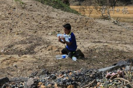 一名小童抱了數瓶得來不易的礦泉水,珍惜極了!(圖:星洲日報)