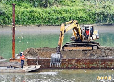 搜救人員利用怪手挖掘河床,尋找可能的失蹤者。(記者王敏為攝)